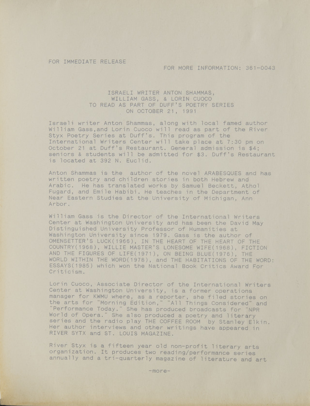 Israeli Writer Anton Shammas, Willima Gass, & Lorin Cuoco to read as part of Duff's Poetry Series on Ocotober 21, 1991 (Image)