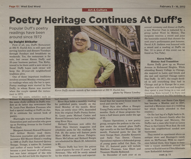 - Newspaper clippings spotlighting poetry events at Duff's Restaurant