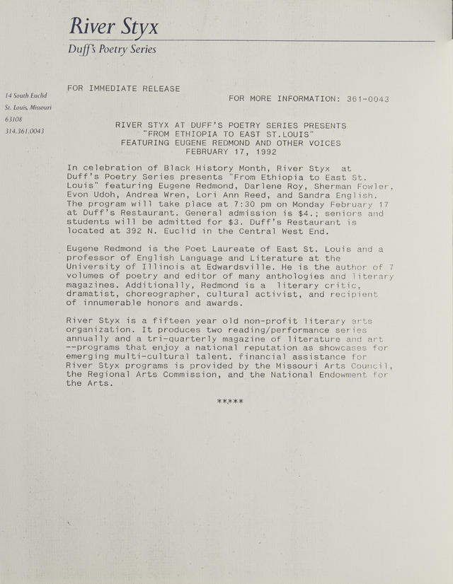 River Styx at Duff's Poetry Series Presents "From Ethiopia to East St. Louis" Featuring Eugene Redmond and Other Voices February 17, 1992 (Image)