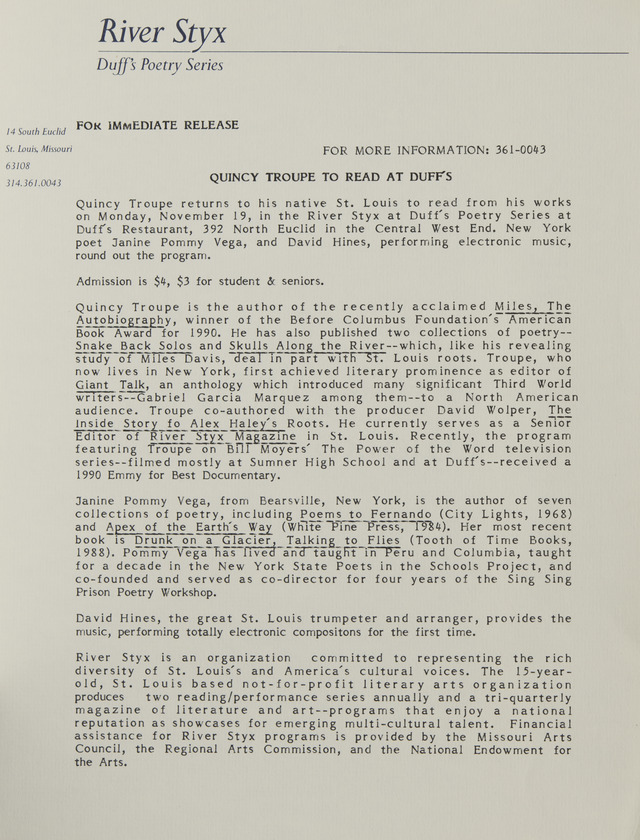 Quincy Troupe to Read at Duff's Announcement (Image)