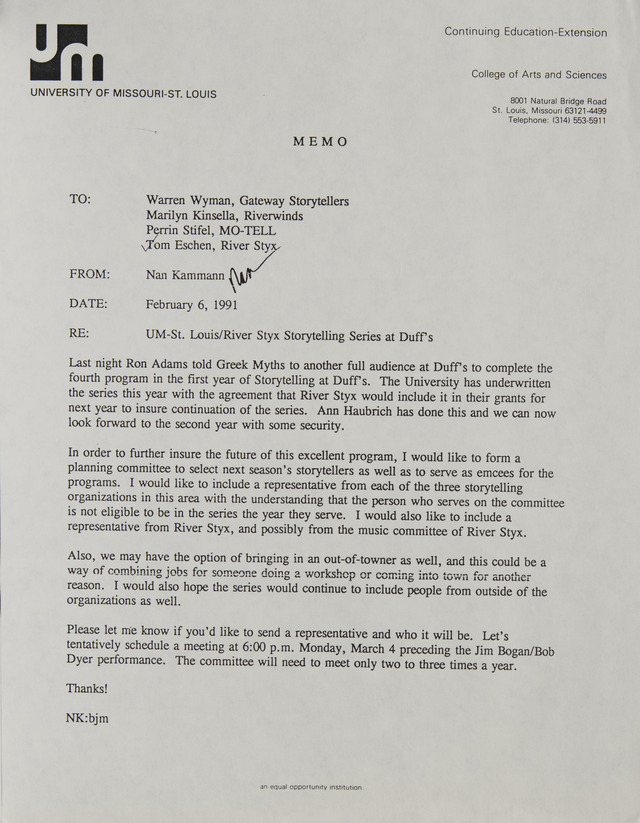 Nan Kammann's memo to Warren Wyman, Marilyn Kinsella, Perrin Stifel, Tom Eschen about forming a planning committee to select the next season's storytellers at River Styx.