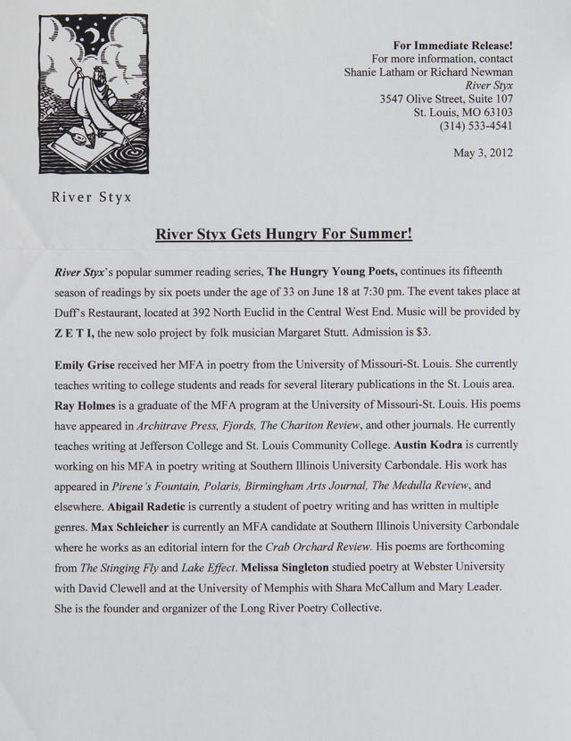 - River Styx's summer reading series "The Hungry Young Poets" continues its fifteenth season of readings by six poets under the age of 33.
