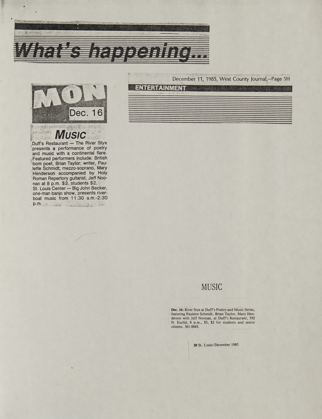 Music: Duff's Restaurant-The River Styx presents a performance of poetry and music with a continental flare. (Image)