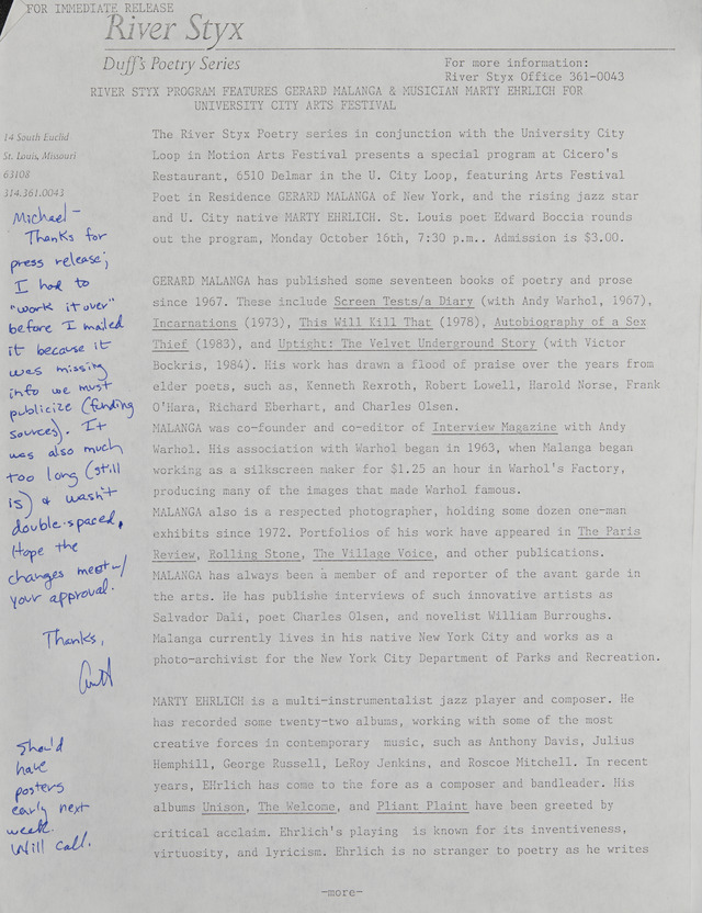 - For Immediate Release, River Styx program will feature Poet Gerard Malanga, Musician Marty Erhlich, and poet Edward Boccia