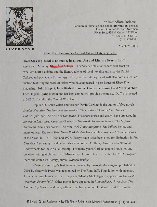 River Styx Announces Annual Art and Literary Feast (Image)