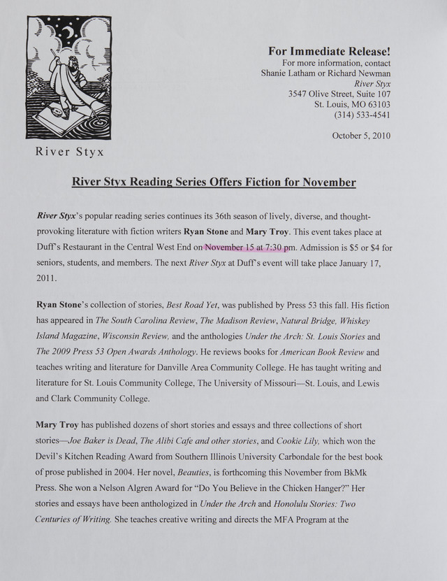 River Styx Reading Series Offers Fiction for November (Image)