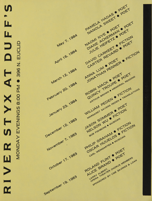 - Creator: River Styx. Contributor: Flint, Roland; Brand, Alice; Graham, Philips; Hijuelos, Oscar; Sommer, Jason; Wu, Nelson; Peden, William; Mack, Robin; Troupe, Quincy; Lum, Anna; Penner, Jonathan; Carkeet, David; Revard, Carter; Nye, Naomi; Ackerman, Diane; Heifetz, Julie; Sweet, Nanola; Hadas, Pamela