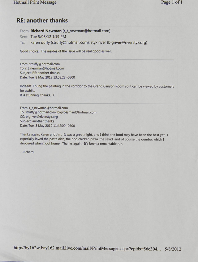 Richard Newman sent email to Karen Duffy and River Styx organization to thank her and Jim for dinner. She sent a reply and thanked him for a painting that she hung in the corridor to the Grand Canyon room to be viewed by customers.