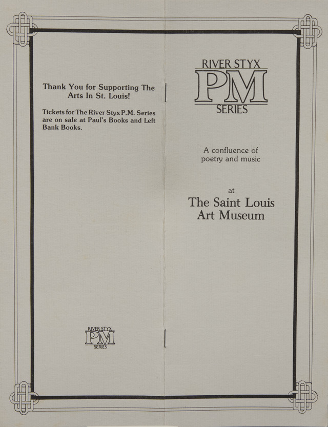- Creator: River Styx. Contributor: Nemerov, Howard; Ramos, Manuel; Irving, John; Gass, William; Slatkin, Leonard; Van Duyn, Mona; Jordan, Roland; Berg, Jacob; Mottl, Mary; Gaspar, Carole; Pinckney, Maria; Hendry, Robin; Poulenc, Francis; Bach, J.S., Swenson, May; Danforth, William; Stravinsky, Igor; Silfies, George; Big River Board of Directors; The River Styx P.M. Series Officers; River Styx P.M. Series Benefactors;