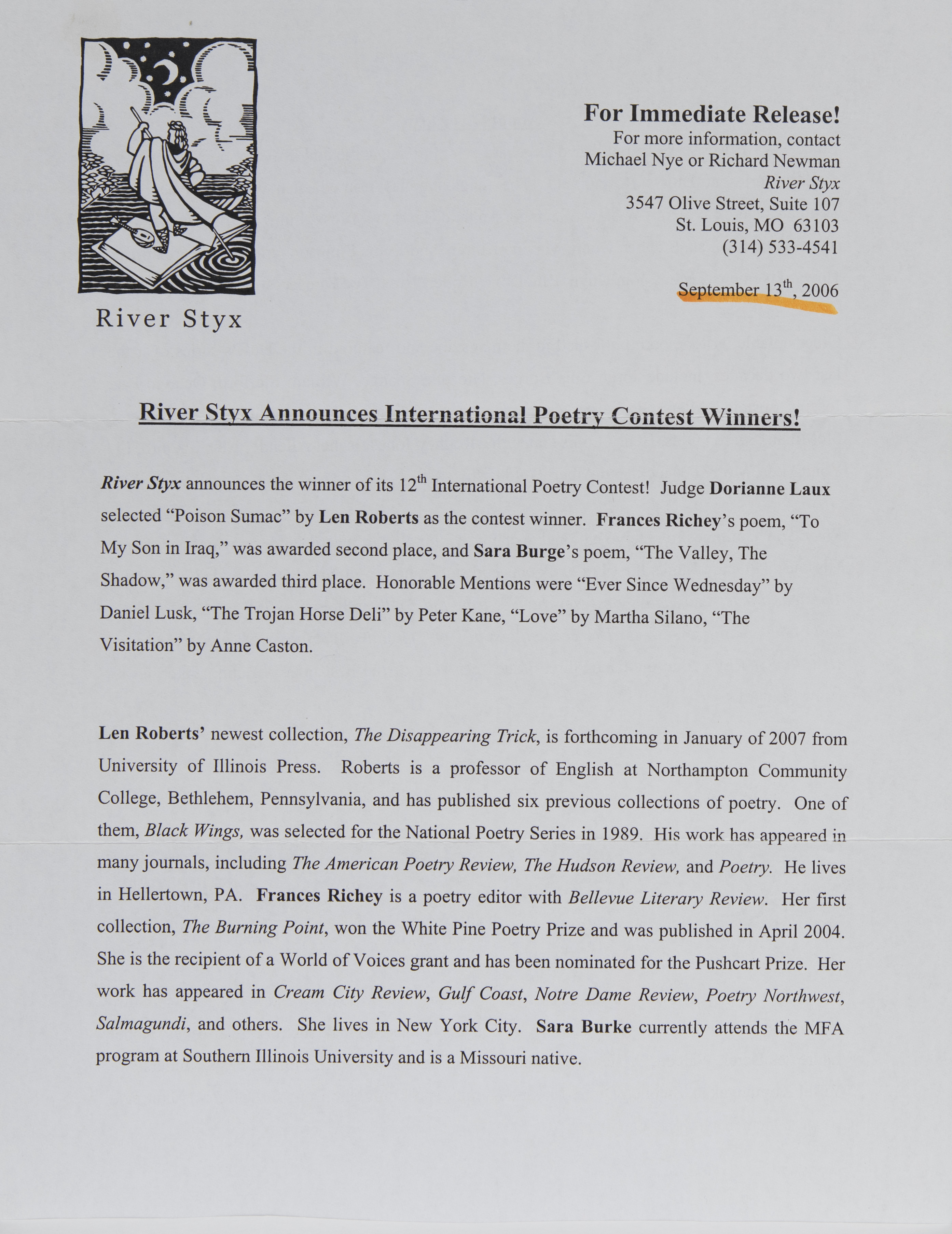 River Styx Announces International Poetry Contest Winners! (Image)